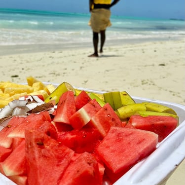 Arrivati a Mnemba, abbiamo fatto snorkeling in acque cristalline tra pesci coloratissimi. Ci hanno fornito le mascherine e nuotare tra i coralli e le specie marine è stato come entrare in un acquario naturale. Dopo lo snorkeling, ci siamo rinfrescati con tanta frutta fresca, godendoci il sole e il paesaggio mozzafiato.
